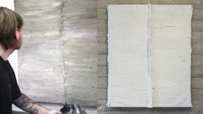 “Erik Uddén connects finished wall fragments with different textures and materiality with plaster processing and painterly brushstrokes to new combinations, where you never really know what are the harvests of chance from the material’s previous life and what the artist has added as a conscious act.