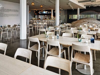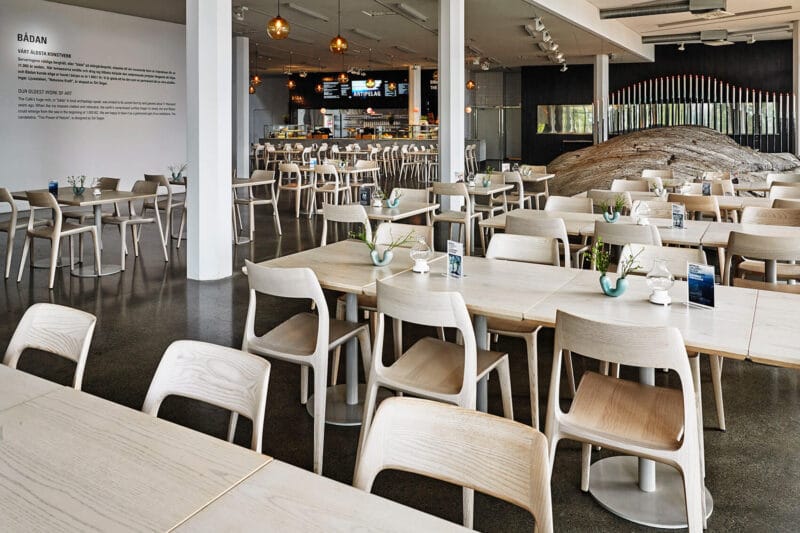 A restaurant and café on the second floor with a large terrace and the huge Gneiss rock in front of the floor to ceiling windows. The space is beautifully decorated with tables and chairs from Artipelag’s own design series November.