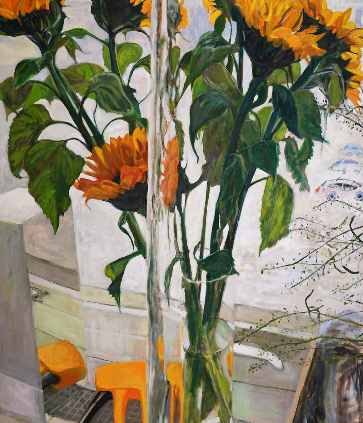 In the painting Windowsill (2024), the sunflowers are multiplied through reflections in mirrors, vases and windows. The bouquet’s bright yellow lustre and deep green tones are accentuated by the snow-covered parking lot outside the studio window. The sunflowers are turned away from the spectator, restricting the colour chord into a triad of yellow, green and white. There is a subtle visual drama in the simple still life on the windowsill, a richness that only appears through the artist’s fully present, subjective mode of seeing.