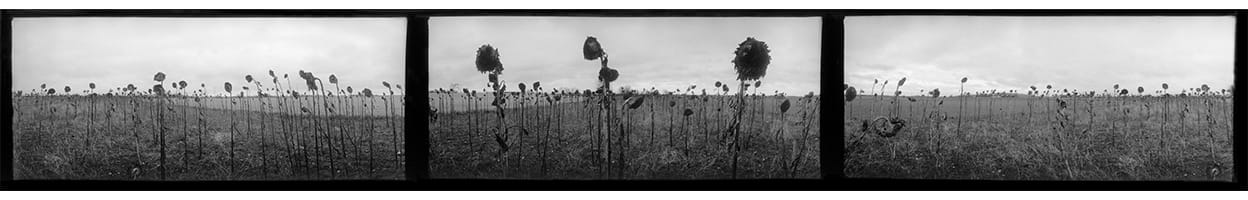 The photographs featured in I Follow the Sun were taken in different places at different times, on countless travels all over the world. The impressive panorama Karaby Landscape is nearly two metres long and give the beholder the sensation of being immersed in a field of sunflowers. Each photo has a 140-degree range, adding up to a 420-degree view. The work has a beautiful, melancholic tone, with sunflowers resembling frail, destitute human figures.