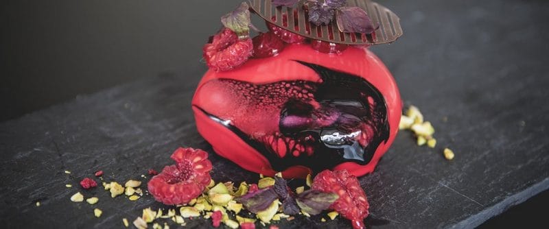 Chocolate pistachio brownie with raspberry jelly and green cardamom.