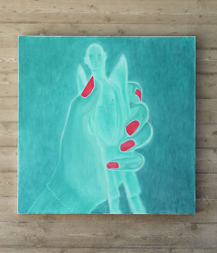 ”I Judit Kristensens målningar är det svårt att inte tänka på den pandemi som vi just har genomlevt under de två senaste åren. Men hennes målningar genomsyras inte av en känsla av den desperata ensamhet som präglat tidens anda. Tvärtom utmärks Judit Kristensens målningar av en kyla som ger dem en närmast observerande och analytisk karaktär. Det framstår inte som särskilt förvånande med tanke på att Judit Kristensen innan sin konstnärliga utbildning utbildade sig till psykolog vid Umeå universitet. Hennes närmast kliniska förhållningssätt till dessa emotionella känslotillstånd vittnar om en djup kunskap om det mänskliga psyket.”
