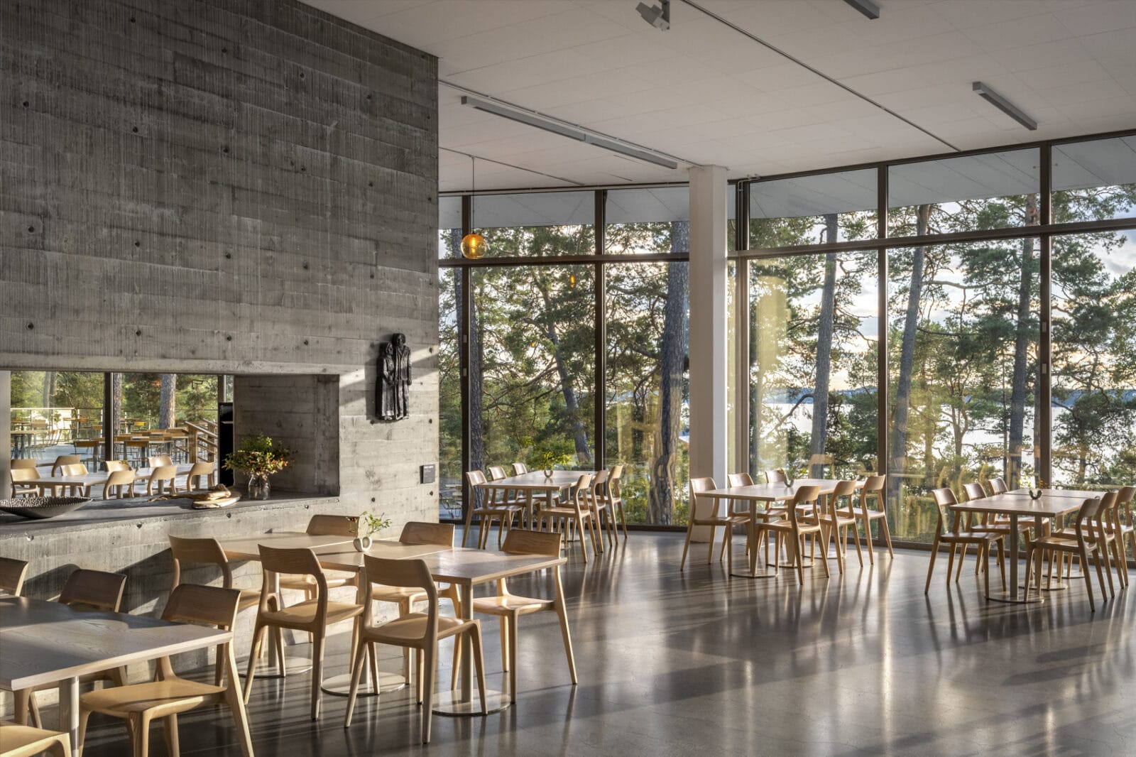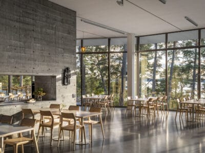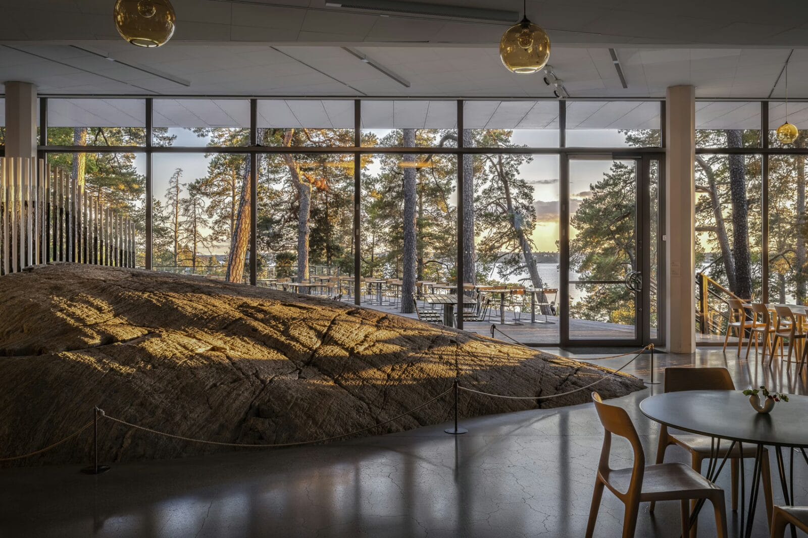 På entréplan finner du Artipelags juvel – den stora naturliga stenhäll eller ”båda” på skärgårdsspråk, som slipats till sin vackra form av istiden och nu breder ut sig i mitten av cafeterian.